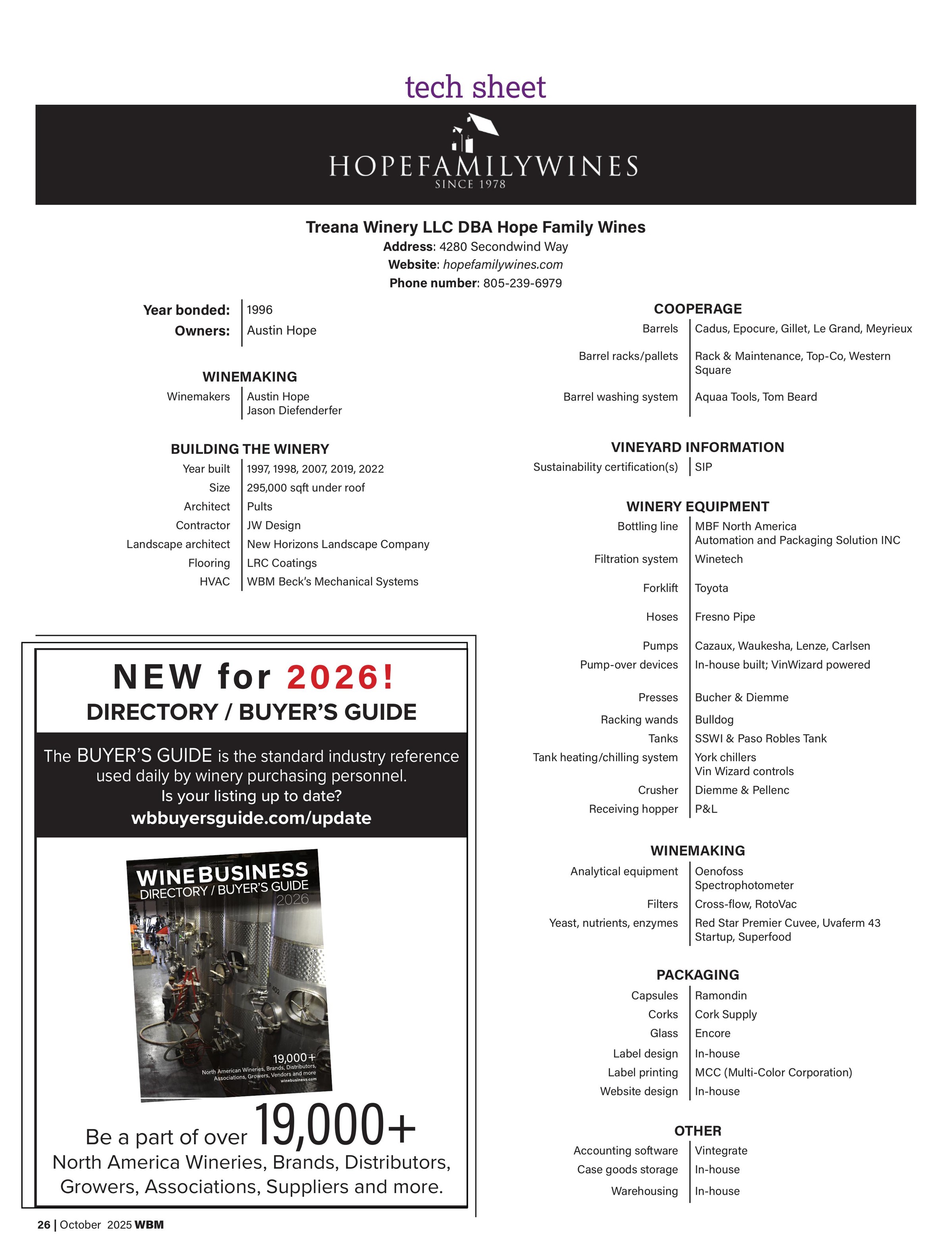 EN UNA ÉPOCA EN LA QUE MUCHAS bodegas californianas se enfrentan a dificultades operativas y de ventas, Hope Family Wines está haciendo lo que pocas pueden presumir: crecer -y crecer- rápidamente. En los últimos cinco años, la empresa familiar de Paso Robles, California, ha duplicado con creces sus ventas en cajas, ha abierto una segunda sala de catas y ha construido un almacén y una planta de embotellado de 140.000 pies cuadrados, verticalmente integrada y diseñada para servir como centro de distribución. Además, en agosto de 2025, la empresa adquirió un nuevo viñedo, Tufera Farms, en la AVA Creston District de Paso Robles. La propiedad, que ha sido durante mucho tiempo una fuente para el Austin Hope Cabernet Sauvignon, también proporcionará trufas orgánicas.